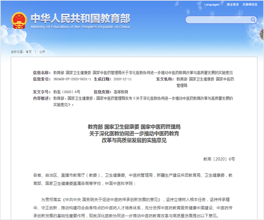 2.《教育部 国家卫生健康委 国家中医药管理局关于深化医教协同进一步推动中医药教育改革与高质量发展的实施意见》